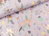 Wunderschöner weicher Baumwolljersey mit Flamingos. Das Besondere an diesem Stoff ist der kupferfarbene Foliendruck von einzelnen Blumen und kleinen Vögeln.