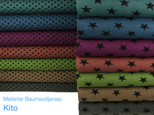 Wundervoller weicher melierter Baumwolljersey Kito aus dem Hause Swafing Stoffe. Kito gibt es mit Punkten oder Sternen und kann prima miteinander kombiniert werden. Die schwarzen Sterne haben einen Durchmesser von ca. 3,5 cm. Farbe: jeansblau meliert mit schwarzen Sternen Material: 72%Baumwolle/23%Polyester/5%Elastan Breite: 155cm Zertifizierung: Öko-Tex-Standard 100 Gewicht: ca. 220 g/m² Waschbar bei 30 Grad.