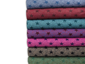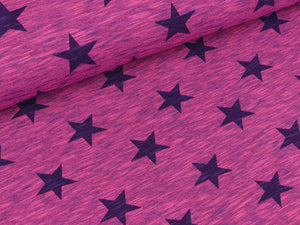 Hochwertiger melierter Jersey Nick aus dem Hause Swafing Stoffe. Der Stoff ist durchgefärbt und sehr gut dehnbar. Die Sterne haben einen Durchmesser von ca. 3,5cm. Farbe: beere - lila Material: 70%Baumwolle / 26%Polyester / 4%Elastan Breite: 150cm Gewicht: ca. 200g/m² Zertifizierung: Öko-Tex-Standard 100 Waschbar bei 30 Grad. Bitte keine Waschmittel mit optischem Aufheller verwenden.