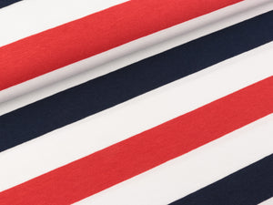 Weicher Baumwolljersey "Gala" von Swafing Stoffe mit Streifen. Die Streifen sind garngefärbt. Die Streifen haben eine Breite von ca. 3cm. Muster: Blockstreifen Farbe: rot - weiß - dunkelblau Material: 94% Baumwolle / 6% ElastanBreite: 160cm Gewicht: ca. 220g/m² Zertifizierung: Öko-Tex-Standard 100 Waschbar bei 30 Grad. Bitte immer auf Links waschen.