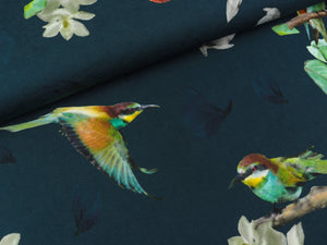 Auf dem Baumwolljersey "Sonado" blühen die Magnolien in voller Pracht und man sieht farbenfrohe Vögel - Bienenfresser - mit ihrem spektakulär gefärbten Gefieder. Diese Zugvögel legen nach der Brut und Aufzucht in Andalusien ihren letzten Stop ein, bevor sie in ihrer Wintergebiete nach Afrika ziehen. Soñado (Sonjado ausgesprochen) heißt auf Deutsch so viel wie "geträumt" - die Mischung aus Vögeln,...