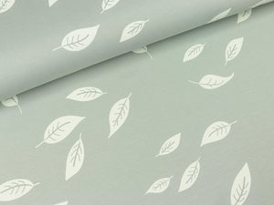 Neuer Baumwolljersey/Interlock mit Blättern. Die großen Blätter sind ca. 7 cm lang und 2,5cm breit. Farbe: Hellgrau-Weiß Material: 95%Baumwolle/5%Elastan Breite: 155cm Zertifizierung: Öko-Tex-Standard 100 Gewicht: ca. 250 g/m² Waschbar bei 30 Grad.