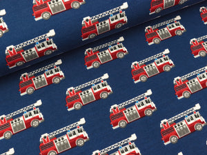 Wundervoller weicher Baumwolljersey mit kleinen Feuerwehrautos. Die Feuerwehr ist ca. 6cm lang und 3cm hoch. Muster: Feuerwehr Farbe: dunkelblau - rot Material: 95% Baumwolle / 5% Elastan Breite: 150cm Gewicht: ca. 200g/m² Zertifizierung: Öko-Tex-Standard 100 Produktklasse 1 Waschbar bei 30 Grad.