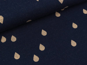 Eine einmalige Kombination aus Jacquard & Soft-Touch Lurex & nachhaltiger Produktion Made in Germany. Durch den Einsatz von hochwertigstem Soft-Touch Lurex erhält der Stoff trotz GLITZER einen unverwechselbaren weichen Griff - Innovation made in Germany. Farbe: blue navy - gold Design: Glow Drops Kollektion: Glow Die Tropfen sind ca. 20mm hoch und 15mm breit. Material: 94% kbA Bio-Baumwolle / 6% Softtouch...