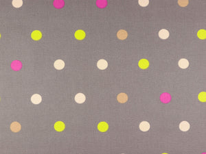 Beschichtete Baumwolle Leona in grau mit bunten Punkten. Geeignet für Tischdecken, Regenbekleidung, Schwimmtaschen, Lätzchen und vieles mehr. Die Punkte haben einen Durchmesser von ca. 1,9cm. Material: 100% Baumwolle acrylbeschichtet Breite: 150cm Waschbar bei 30 Grad, bitte nicht in den Trockner geben. Bügeln Stufe 1 von der linken Seite.