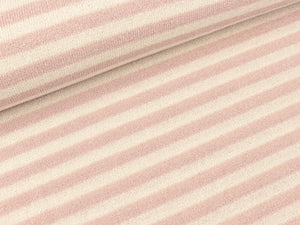 Wunderschöner leichter Glitzerjersey mit Streifen. Die Streifen haben eine Breite von ca. 10mm. Farbe: altrosa - weiß - silber Material: 67% Baumwolle / 23% Viscose / 6% Polyamid / 4% Elastan Breite: 155 cm Gewicht: ca. 180g/m² Waschbar bei 30 Grad, bitte nicht in den Trockner geben.