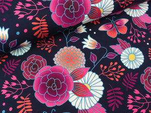 Der einzigartige Griff des Albstoffe Digitaldruck Baumwolljersey-Stoffes wird durch den Einsatz hochwertigster GOTS Bio Garne und einem idealen Stoffgewicht des Druckgrundes erreicht. Entlang einer Webkante verläuft ein bunter Bordürenstreifen. Dieser hat eine Breite von ca. 9,8cm. Kollektion: Sweet Home Farbe: blue navy - bunt Design: Gardener's Delight Material: 95% kbA Bio-Baumwolle / 5% Elastan Breite: 165cm (Extrabreit) Gewicht: ca. 365g...