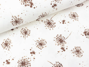Wunderschöner weicher Baumwolljersey mit einem weißen Untergrund. Die Stoffe eignen sich prima für Shirt's, Kleider, Röcke und vieles mehr. Muster: Pusteblumen Farbe: camel brown - weiß Material: 95% Baumwolle / 5% Elastan Breite: 150 cm Gewicht: 200g/m² Zertifizierung: Öko-Tex-Standard 100 Waschbar immer auf Links bei 30 Grad, bitte keine Waschmittel mit optischem Aufheller verwenden. Von der linken Stoffseite vorsichtig bügeln.