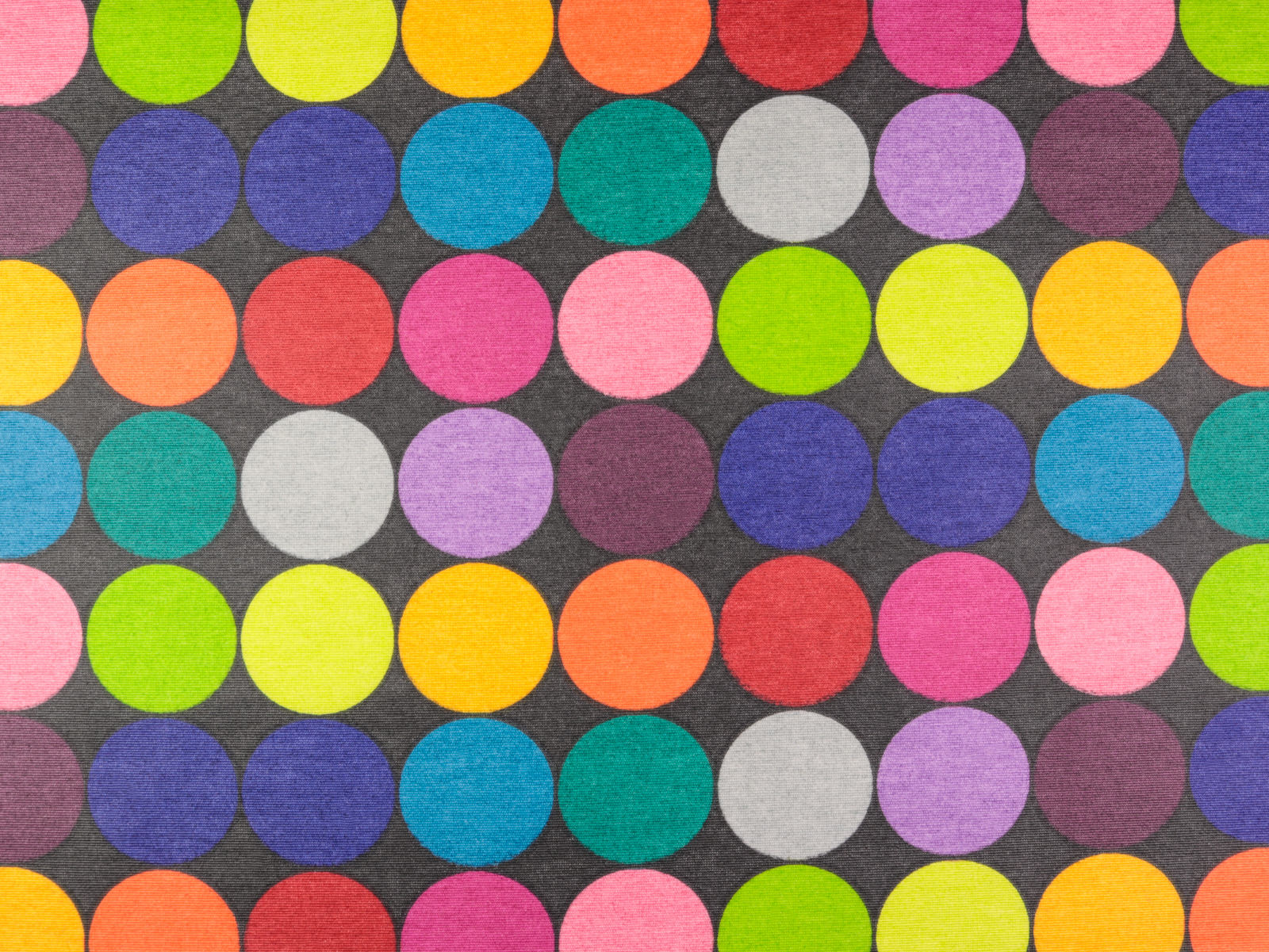 Beschichtete Baumwolle in schwarz mit bunten Punkten.
