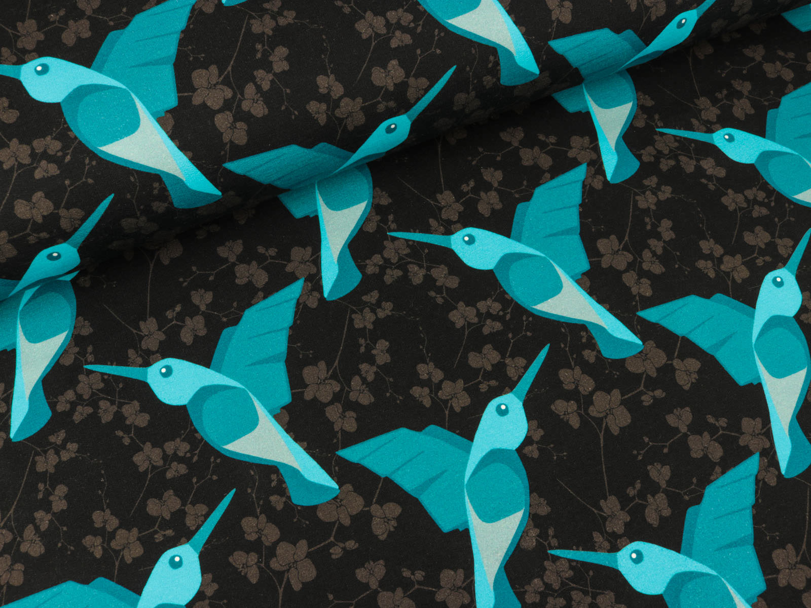 Weicher Baumwollsweat aus der Serie Hummingbird von Bienvenido Colorido für Swafing Stoffe.