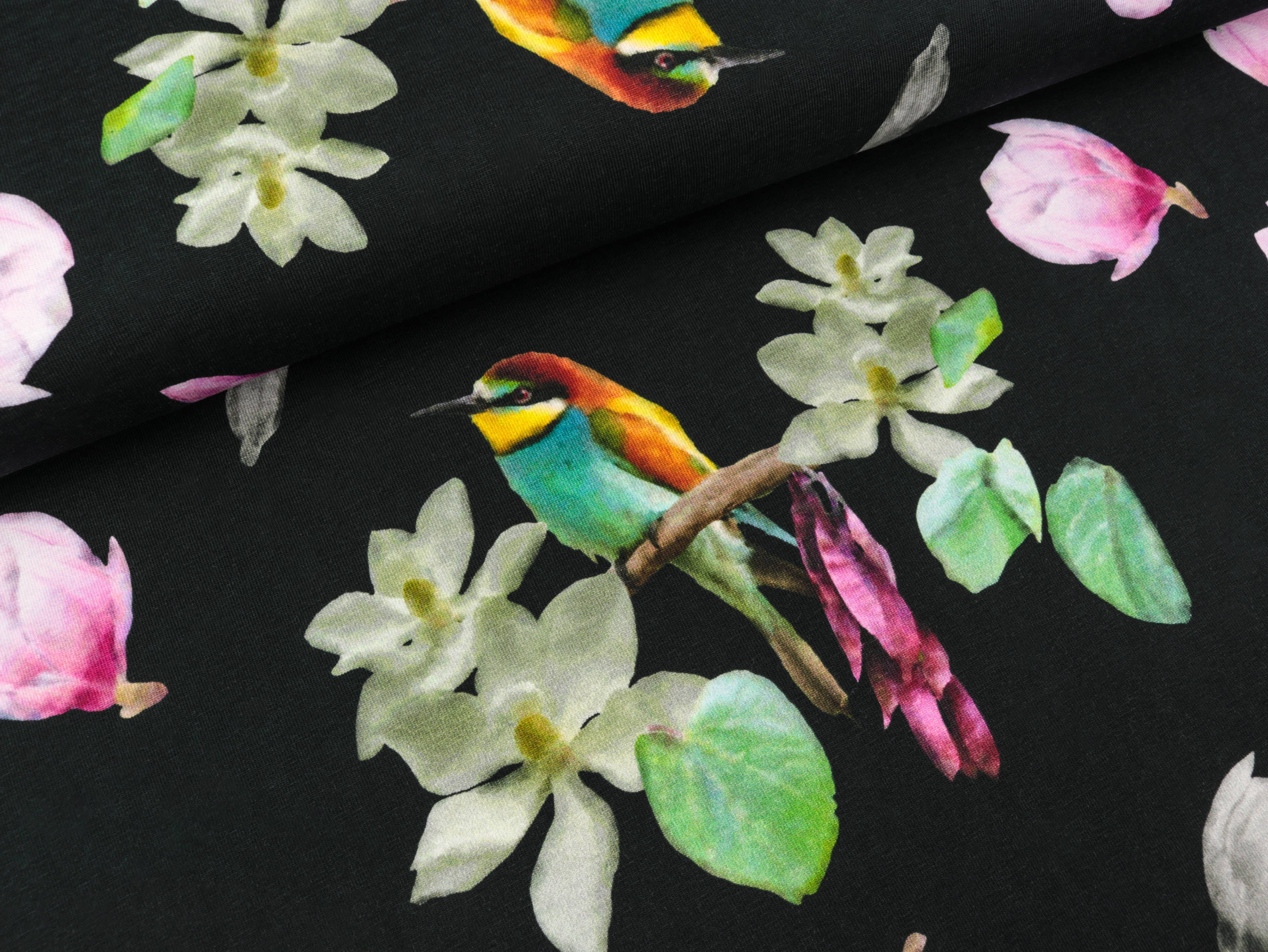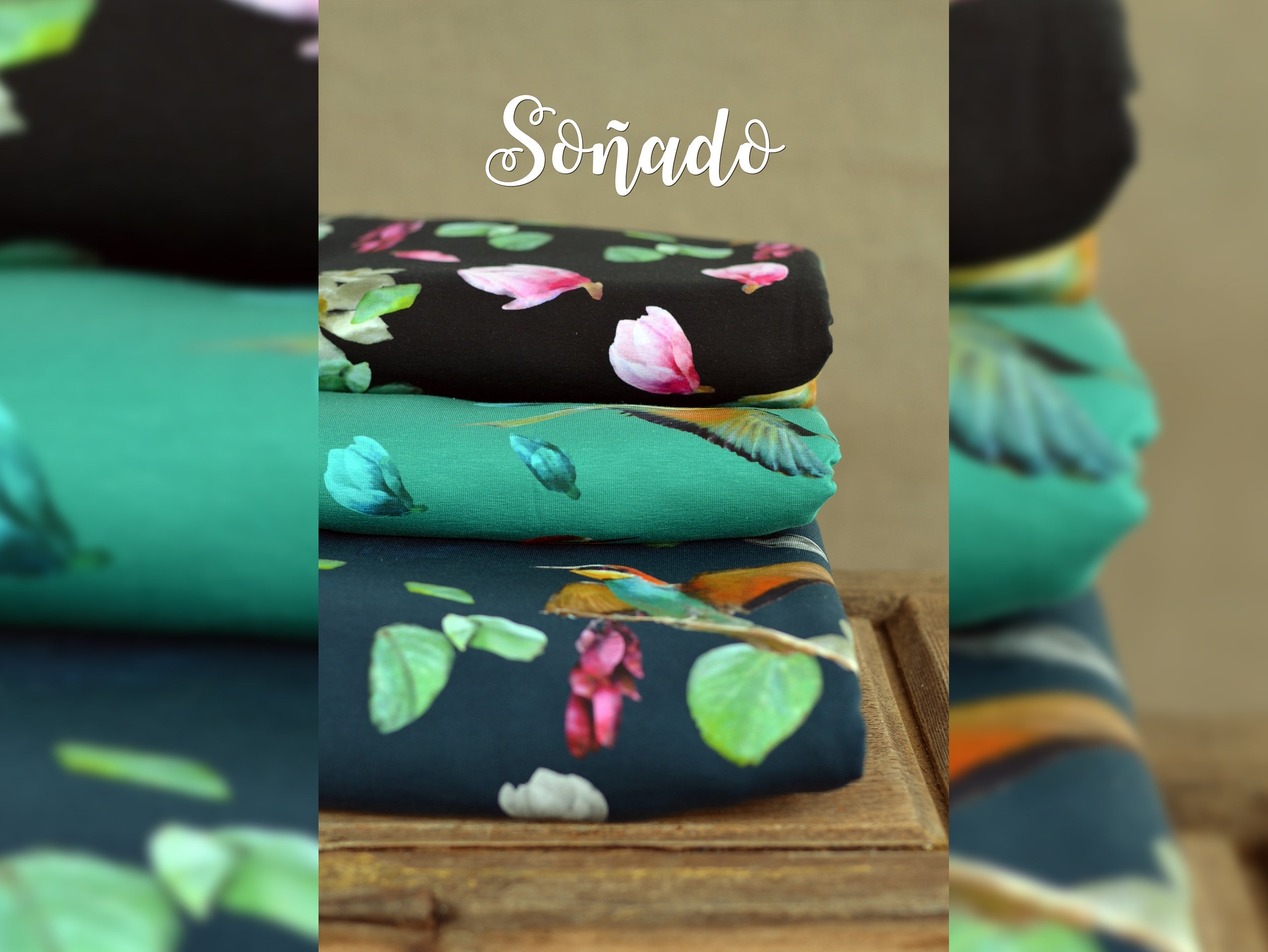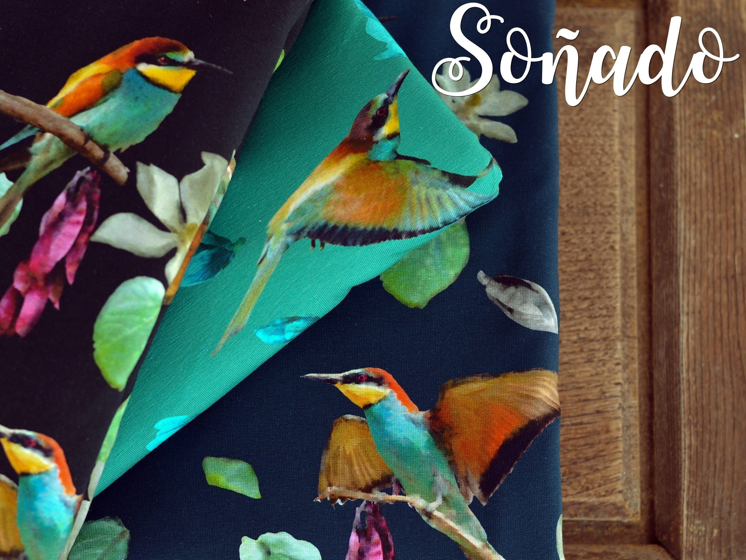 Auf dem Baumwolljersey "Sonado" blühen die Magnolien in voller Pracht und man sieht farbenfrohe Vögel - Bienenfresser - mit ihrem spektakulär gefärbten Gefieder. Diese Zugvögel legen nach der Brut und Aufzucht in Andalusien ihren letzten Stop ein, bevor sie in ihrer Wintergebiete nach Afrika ziehen. Soñado (Sonjado ausgesprochen) heißt auf Deutsch so viel wie "geträumt" - die Mischung aus Vögeln, Blumen, Blättern und Samenschoten auf dem Stoff, in den kräftigen Aquarellfarben erinnert an bunte, fantastische Träume.