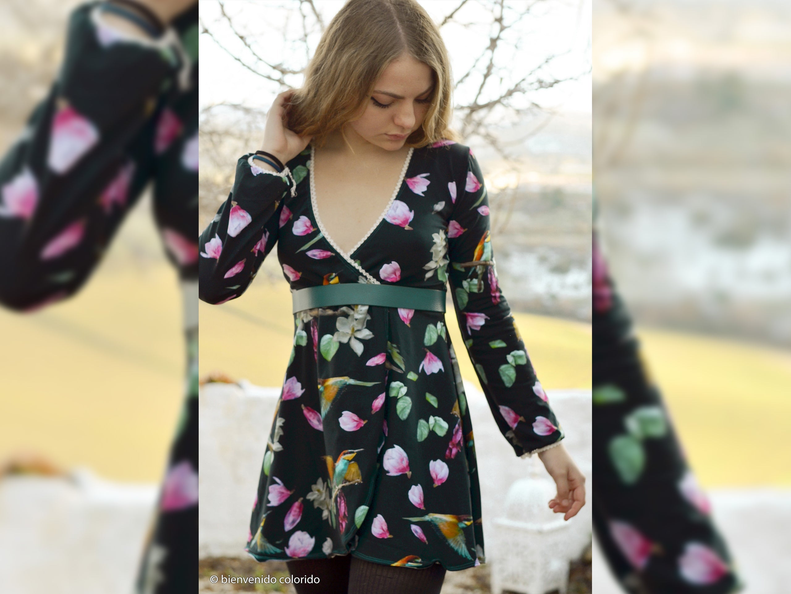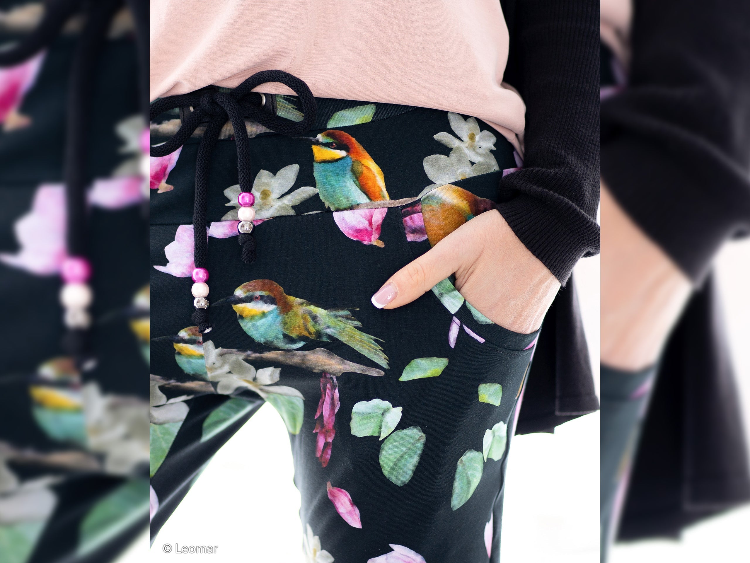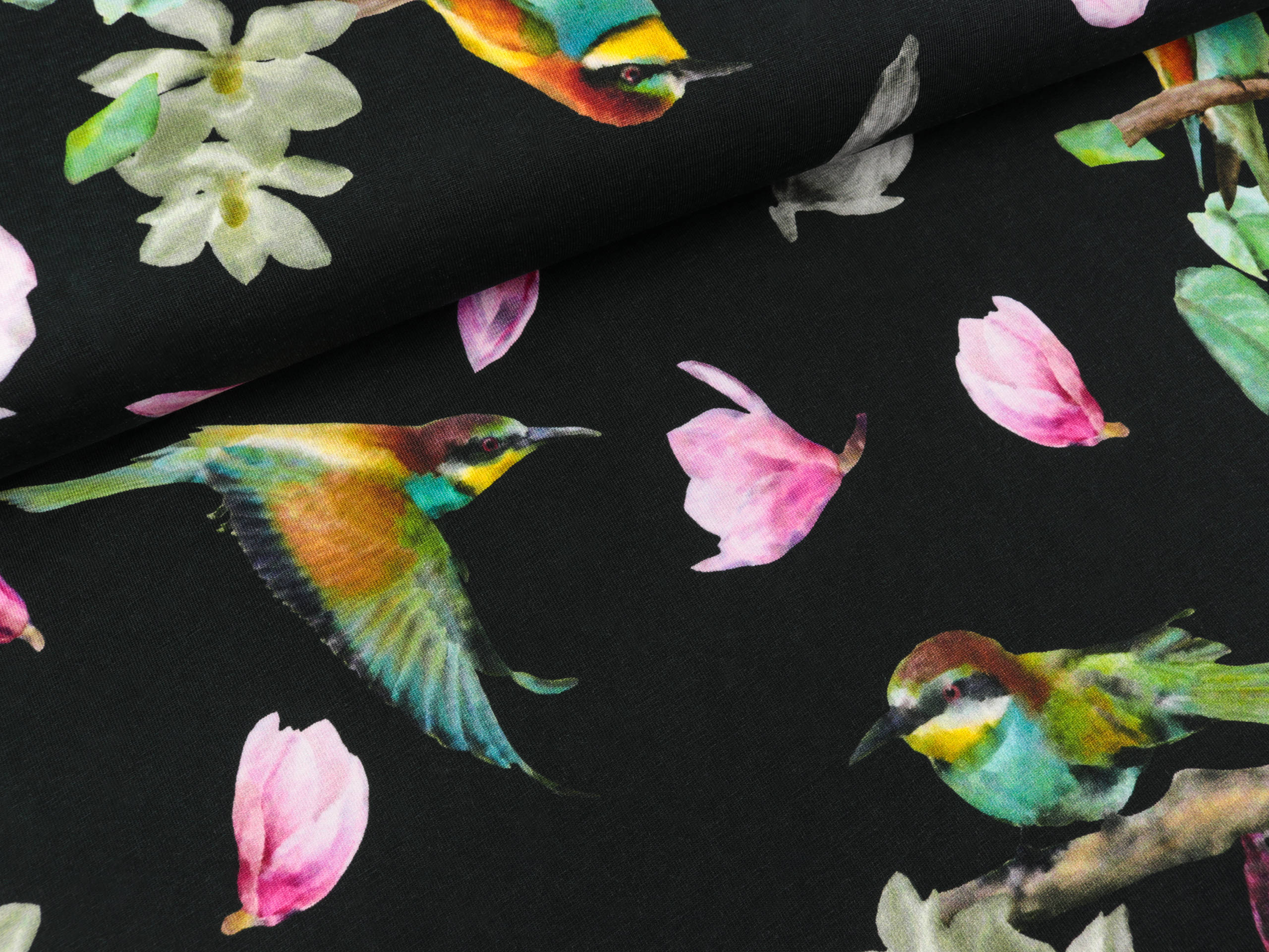 Auf dem Baumwolljersey "Sonado" blühen die Magnolien in voller Pracht und man sieht farbenfrohe Vögel - Bienenfresser - mit ihrem spektakulär gefärbten Gefieder. Diese Zugvögel legen nach der Brut und Aufzucht in Andalusien ihren letzten Stop ein, bevor sie in ihrer Wintergebiete nach Afrika ziehen. Soñado (Sonjado ausgesprochen) heißt auf Deutsch so viel wie "geträumt" - die Mischung aus Vögeln, Blumen, Blättern und Samenschoten auf dem Stoff, in den kräftigen Aquarellfarben erinnert an bunte, fantastische Träume.