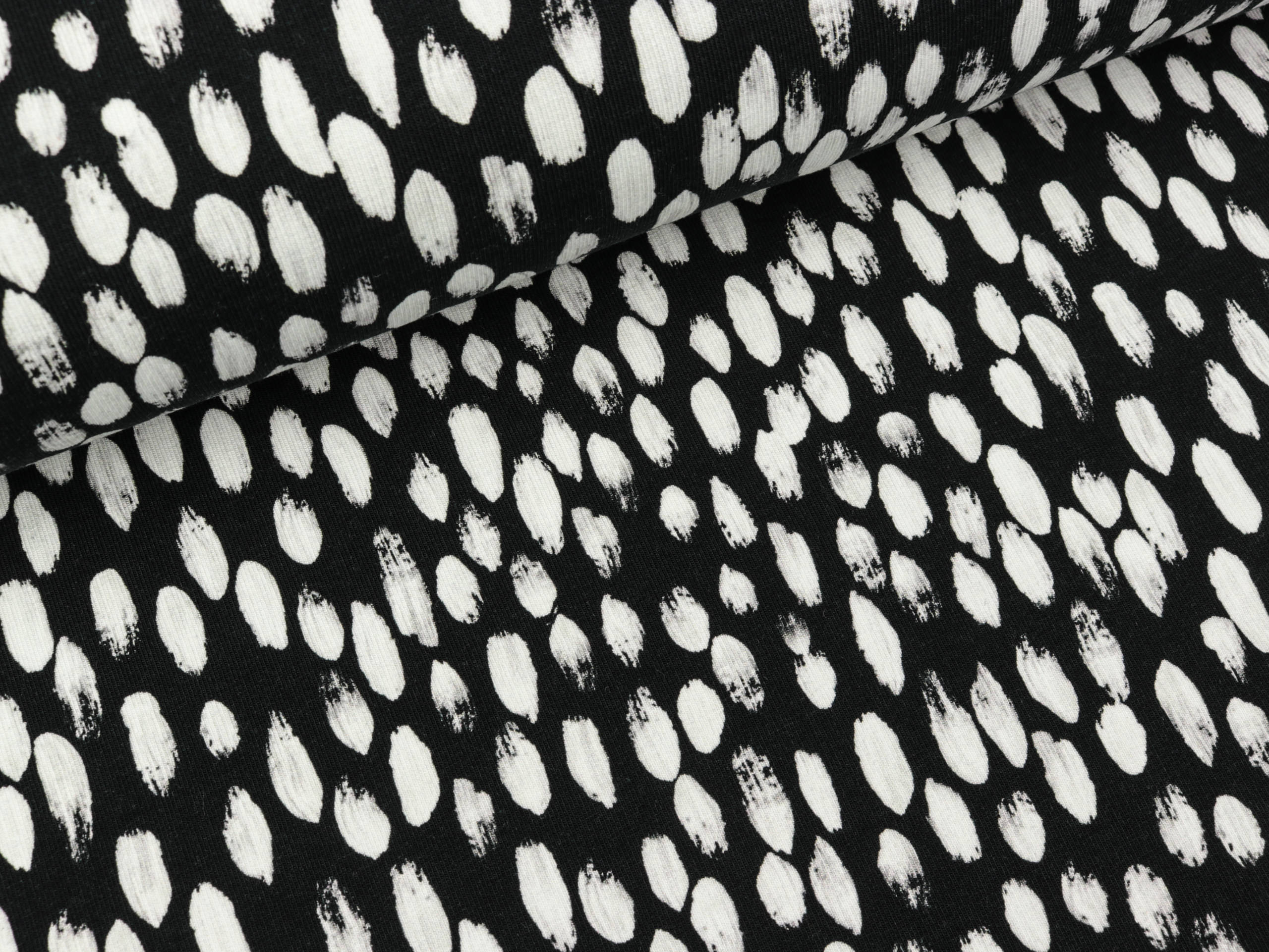 Weicher Modalsweat aus der Herbst-/ Winter Kollektion 2021/22 "#lovelyfavs" von Cherry Picking für Swafing Stoffe. Der Sweat ist innen nicht angeraut. Die Tupfen haben eine maximale Breite von ca. 0,7cm und maximale Länge von ca. 2cm. Kollektion: #lovelyfavs Muster: Brush Design: Cherry Picking Farbe: weiß - schwarz Material: 60% Baumwolle / 35% Modal / 5% ElastanBreite: 150cm Gewicht: 265g/m ²...