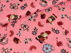 Schöner Baumwollstoff mit einem zuckersüßen Gartenmuster. Gartenzwerge, Schmetterling, Igel und viles mehr tummeln sich munter auf diesem Stoff. Der Gartenzwerg mit der Gießkanne ist ca. 5cm hoch.Farbe: rosa-buntMaterial: 100%BaumwolleBreite: 140cmWaschbar bei 30 Grad, bügeln Stufe 1