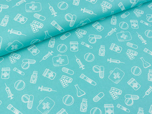 Weicher Baumwollstoff "Toni" von Swafing Stoffe. Muster: Medizinische Symbole Farbe: weiß - mint Material: 100% BaumwolleBreite: 140cm Gewicht: ca. 120g/m² Zertifizierung: Öko-Tex-Standard 100 Waschbar bei 30 Grad. Bitte immer auf Links waschen. Nicht in den Trockner geben und nur von Links bügeln auf Stufe 1.