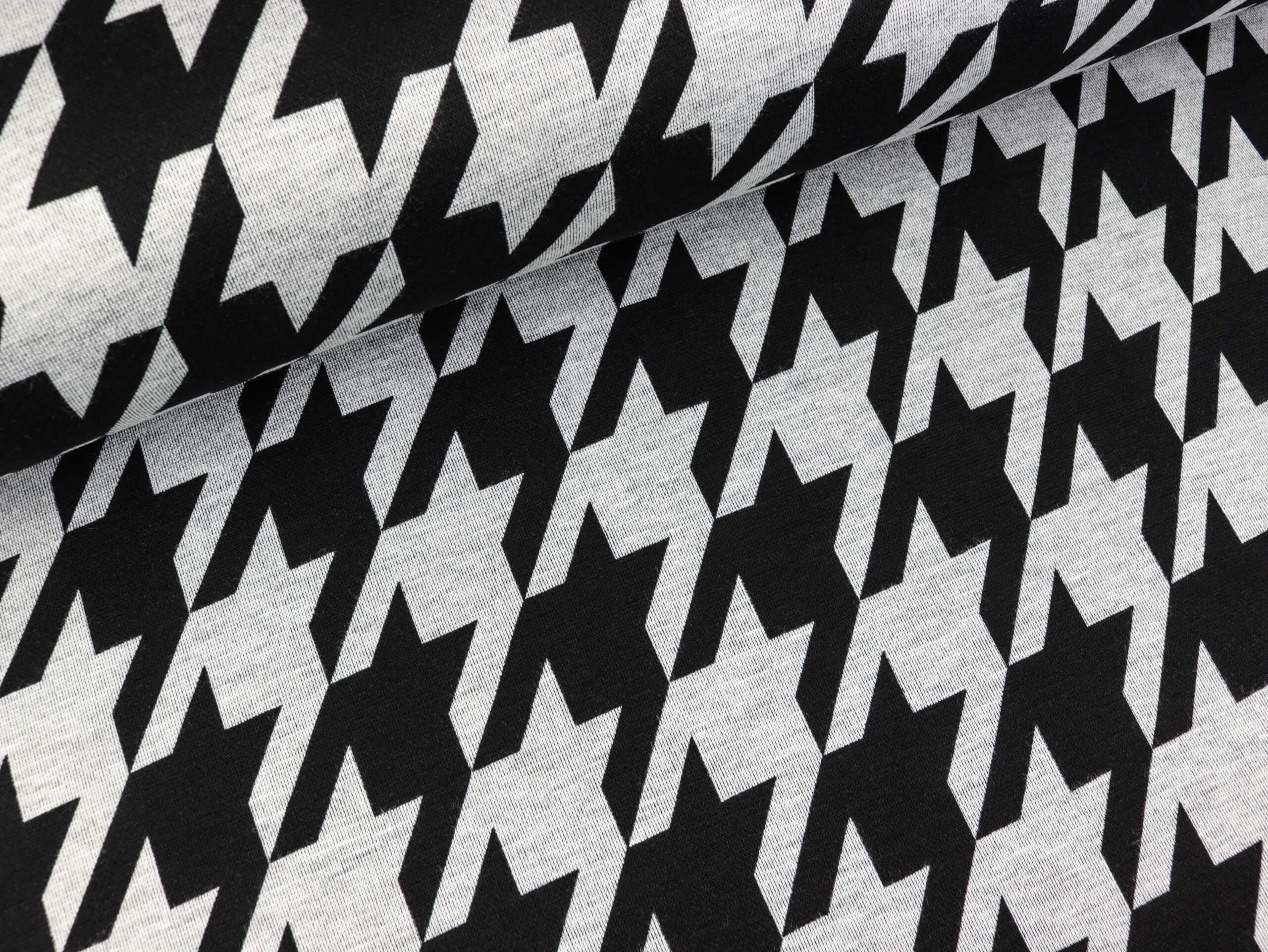 Weich fallender Jersey bedruckt mit einem mittelgroßen Hahnentrittmuster. Der Stoff ist in der Breite gut dehnbar.